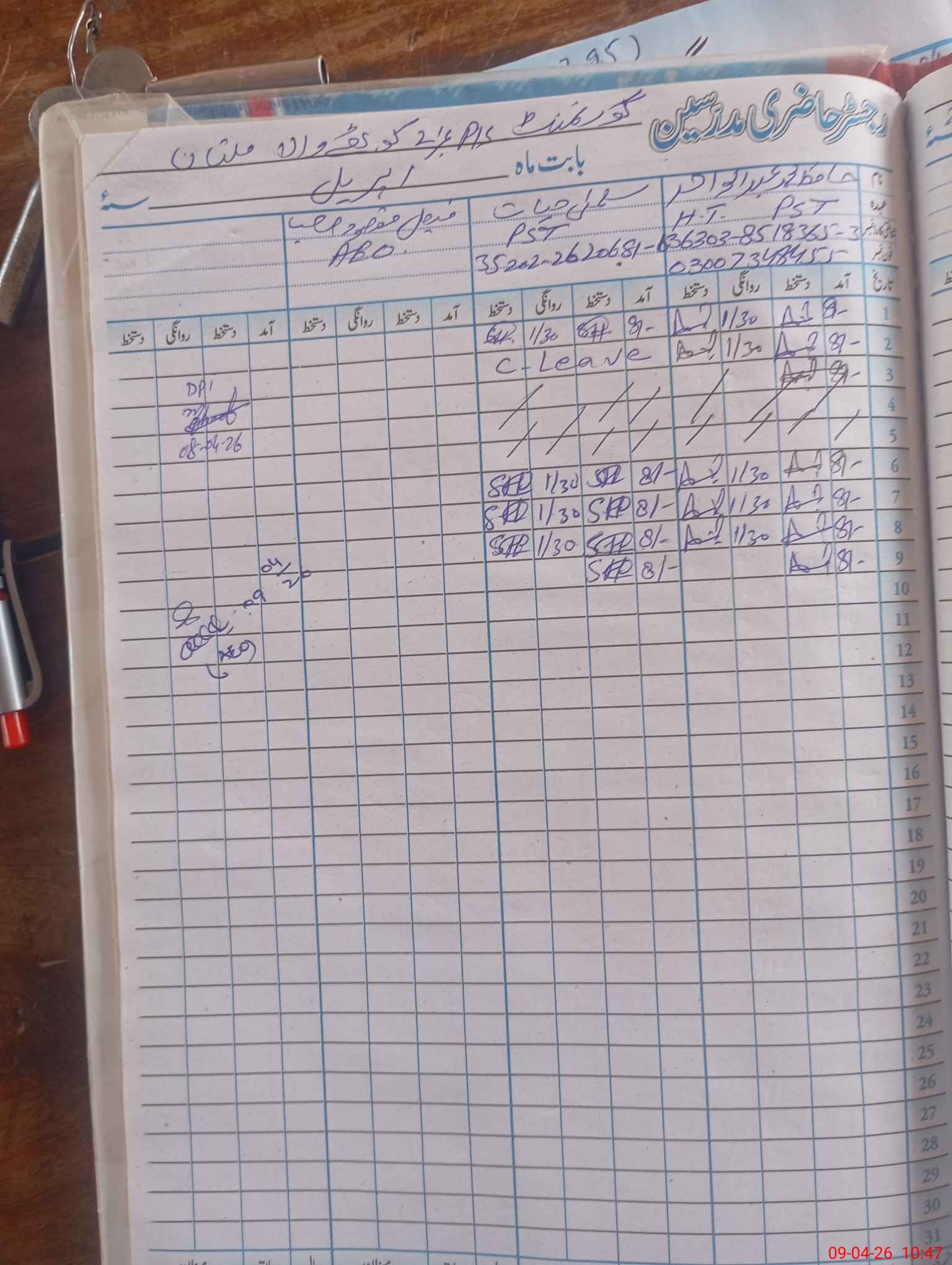 | CNIC | Full Name | Designation | R/C | Absence During Last Calender Month |