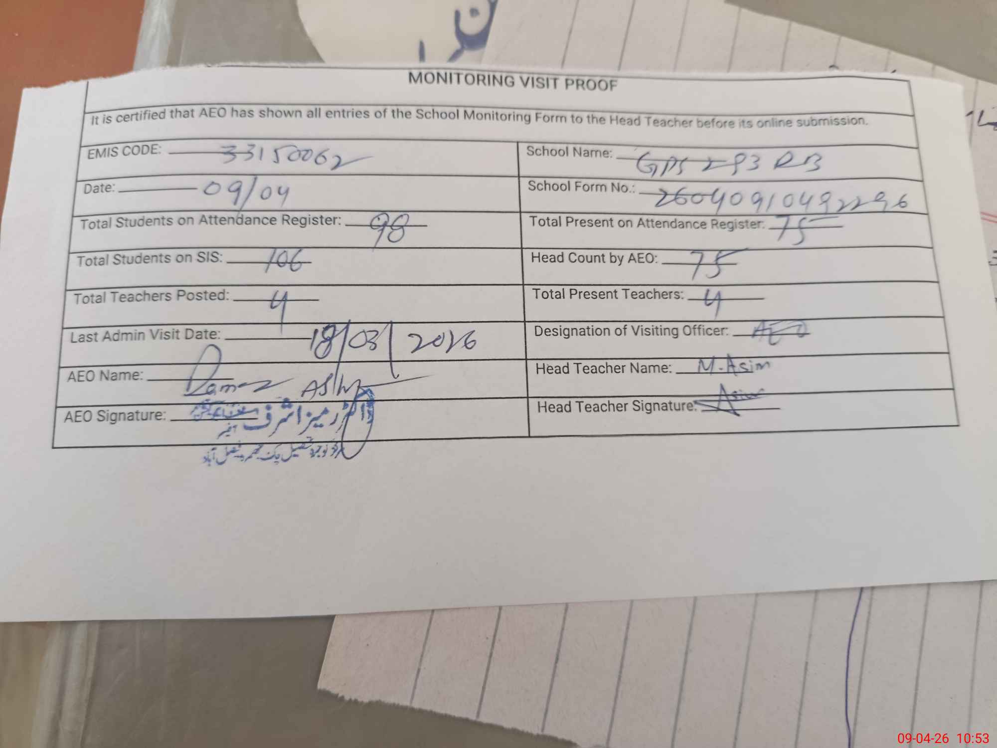 | Attendance Register | Head Teacher | MEA with School | Visit Proof |