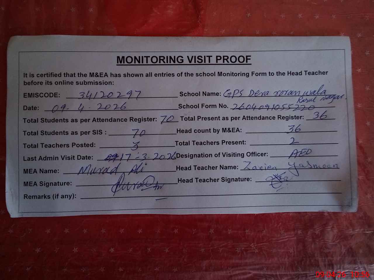 | Attendance Register | Head Teacher | MEA with School | Visit Proof |