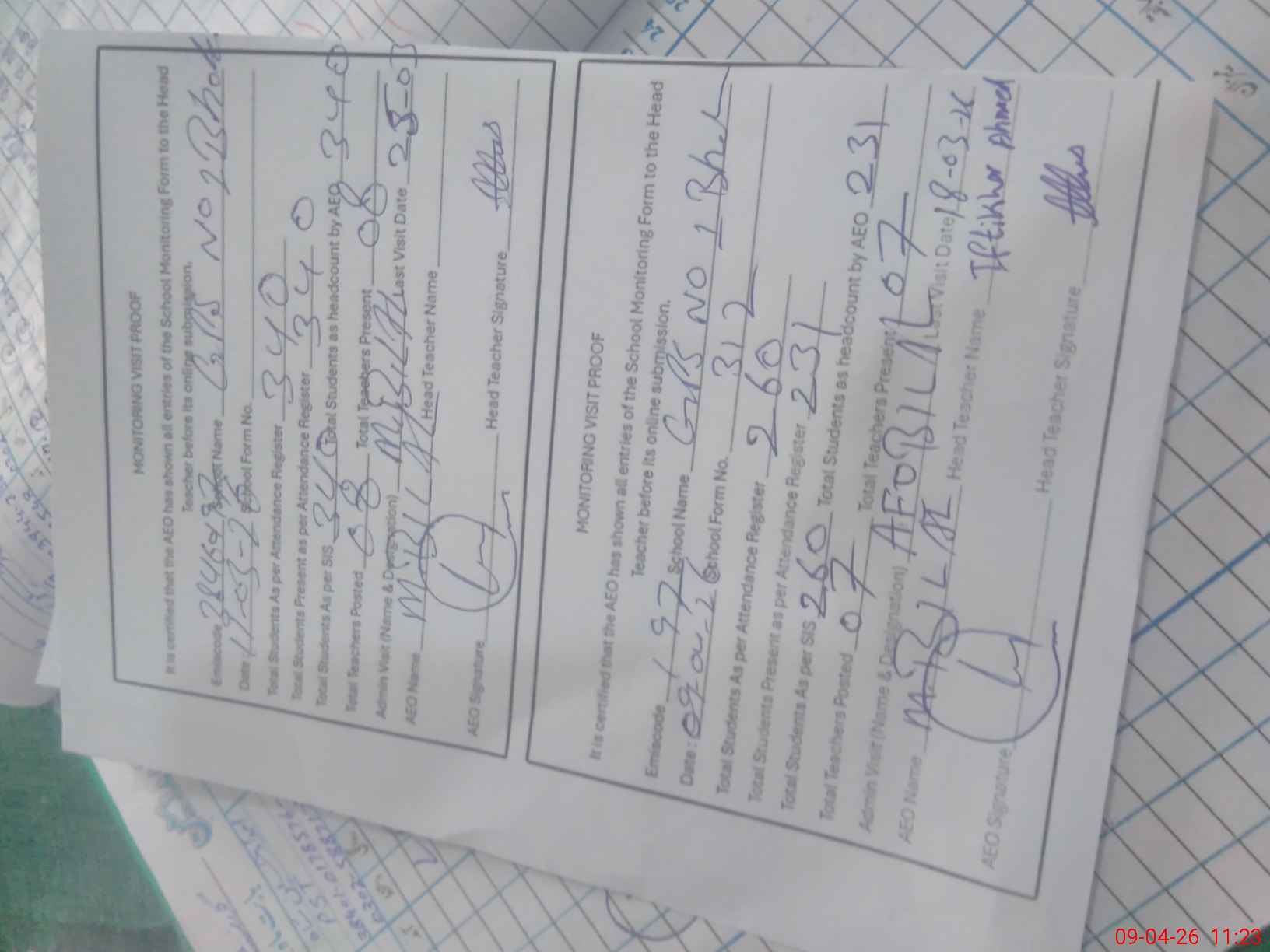 | Attendance Register | Head Teacher | MEA with School | Visit Proof |