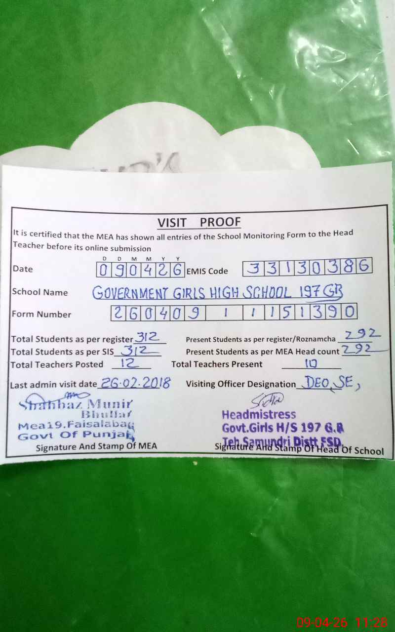 | EMIS Code: 33130386 | Name of School: GGHS CHAK NO 197 GB | |||