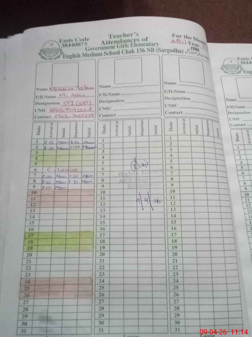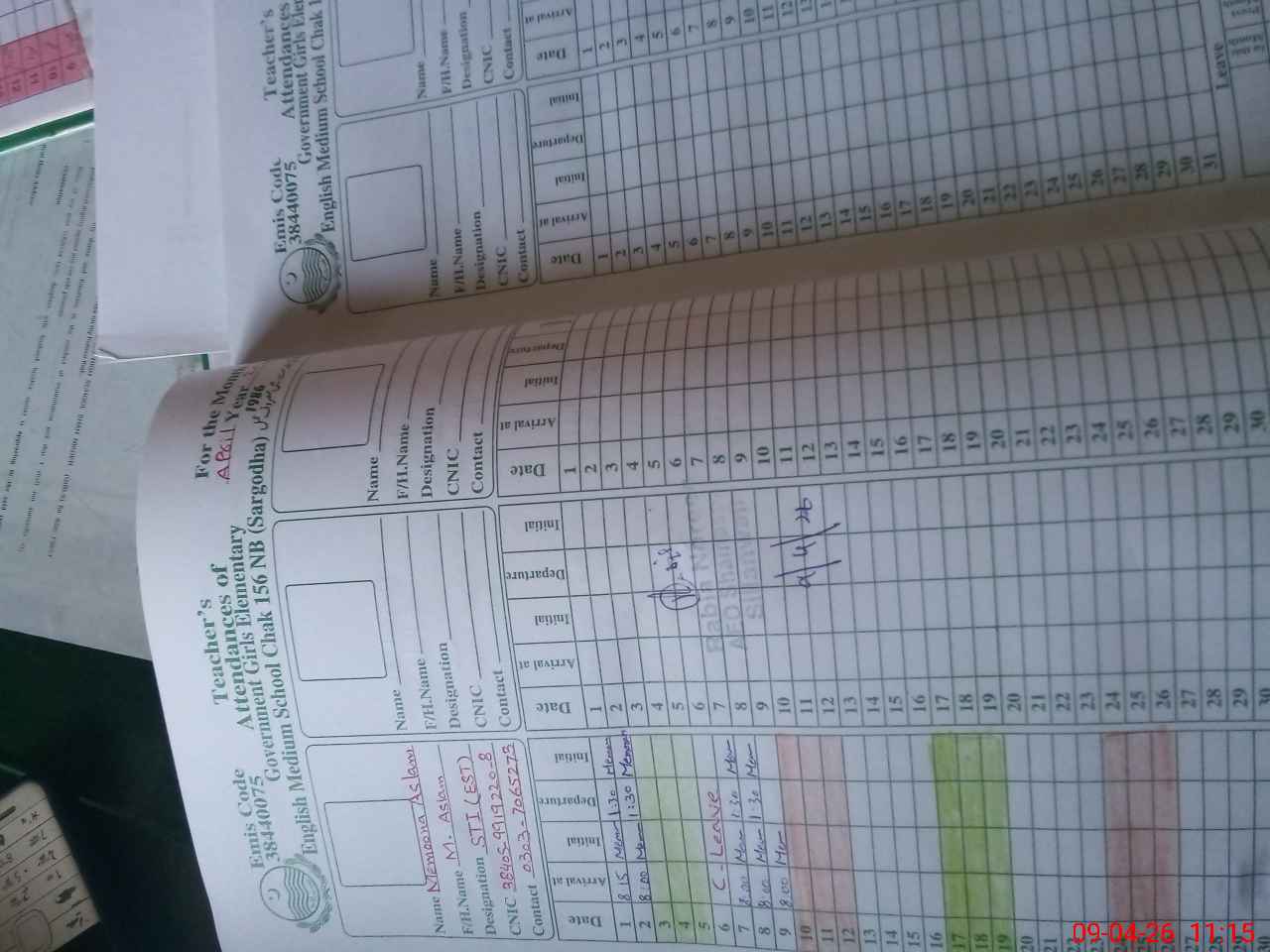 | Name: As**** Ru**** Designation: (School Headmaster's/Headmistress's) EST (AT) Phone/Cell Number: 03**** |