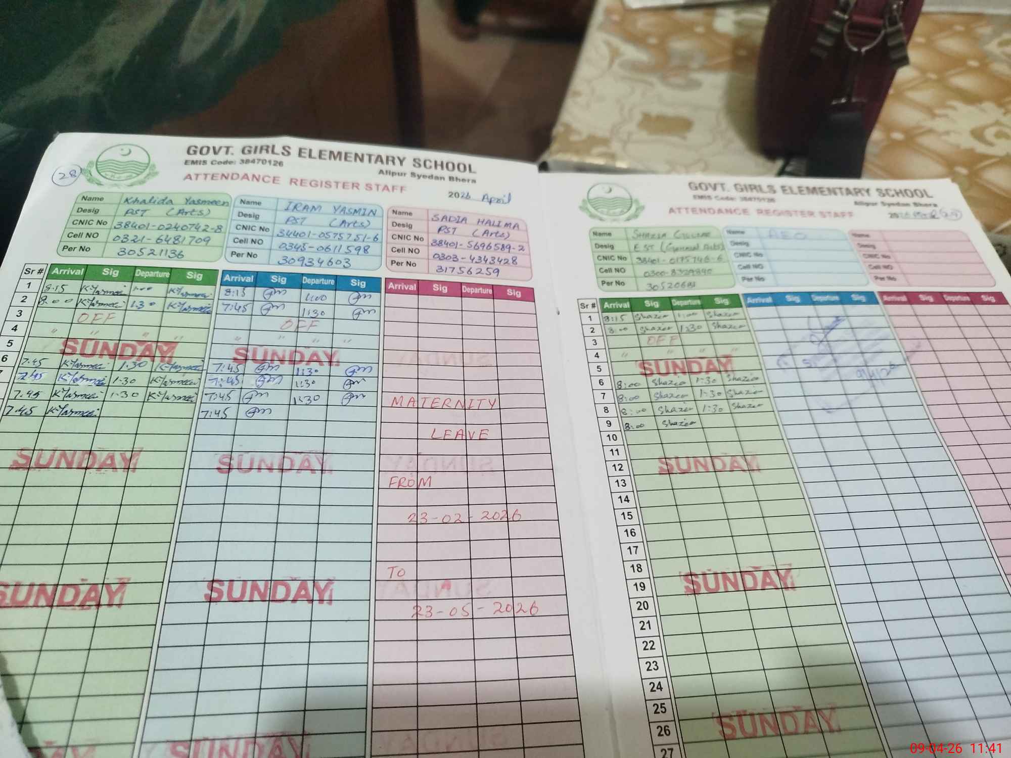 | CNIC | Full Name | Designation | R/C | Absence During Last Calender Month |