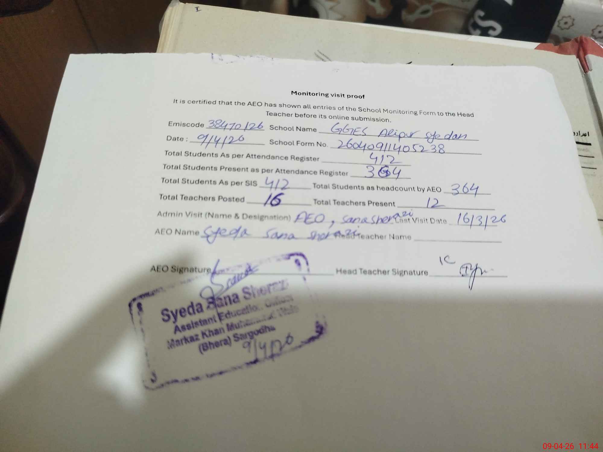 | Attendance Register | Head Teacher | MEA with School | Visit Proof |