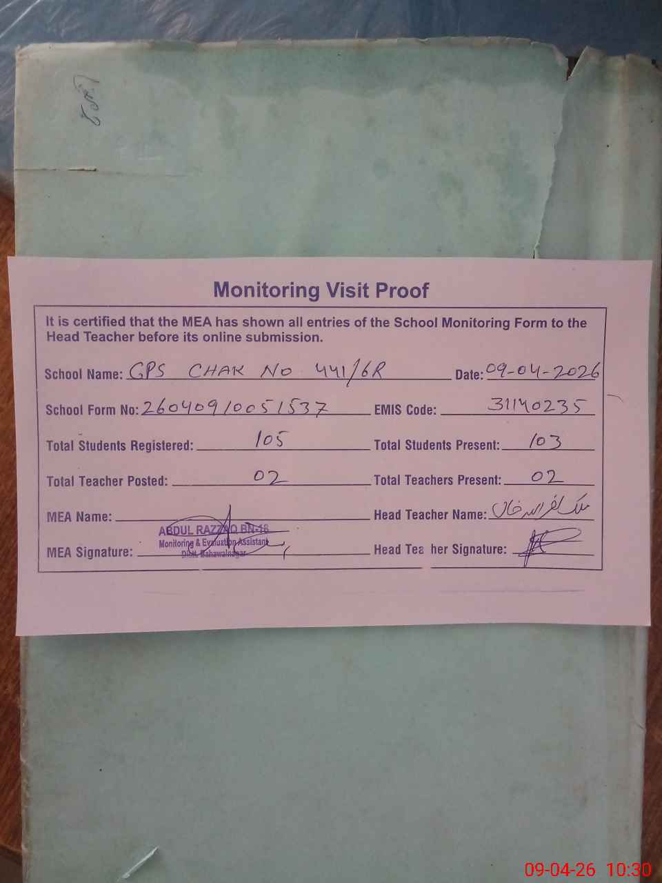 | EMIS Code: 31140235 | Name of School: GPS CHAK NO. 441/6-R | |||