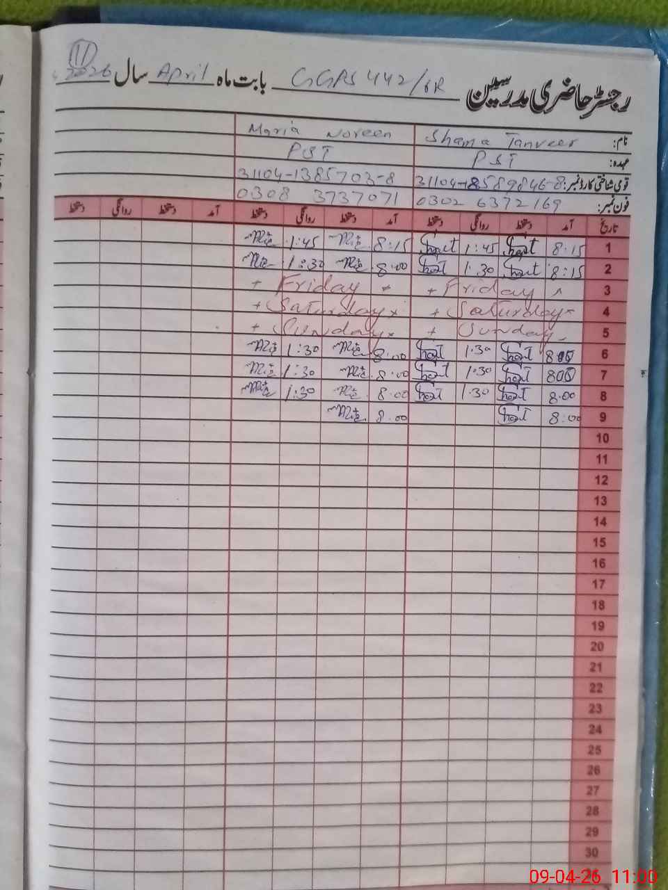 | CNIC | Full Name | Designation | R/C | Absence During Last Calender Month |