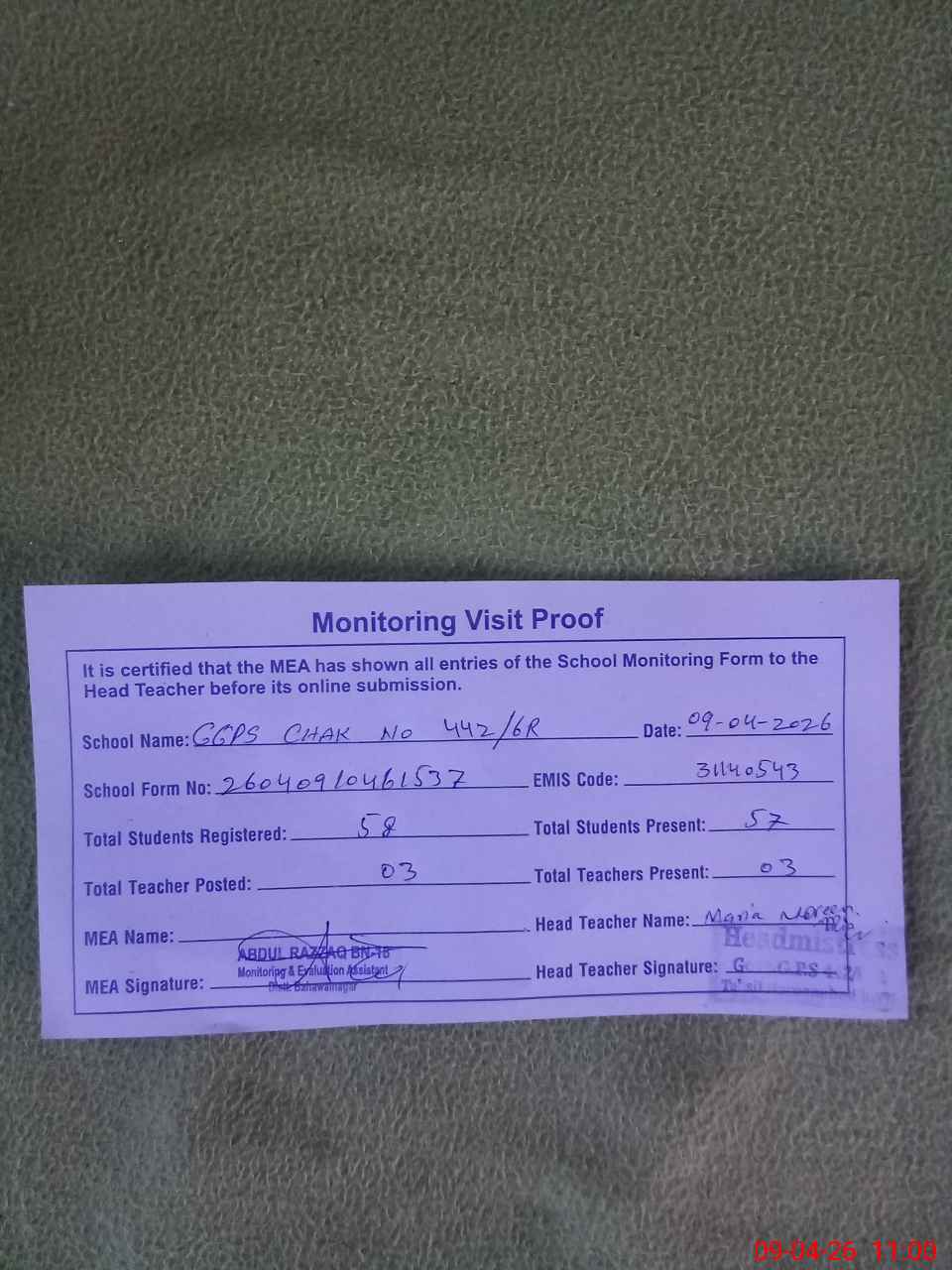 | Attendance Register | Head Teacher | MEA with School | Visit Proof |