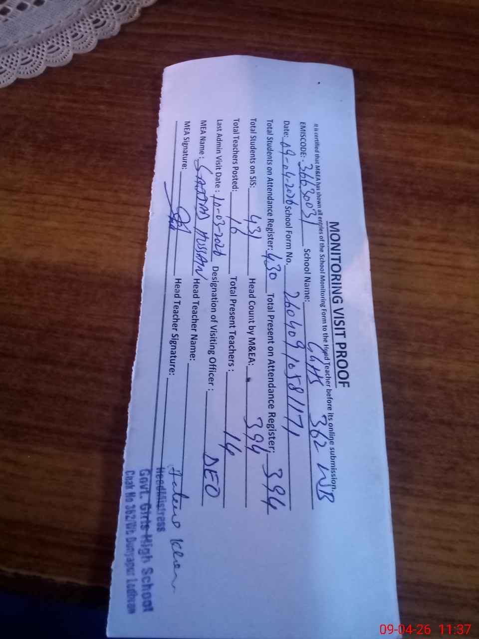 | Attendance Register | Head Teacher | MEA with School | Visit Proof |