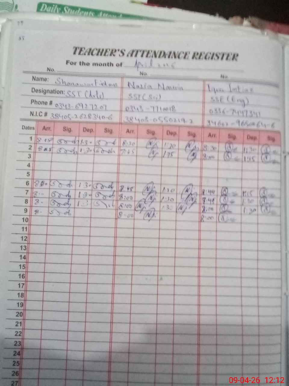 | Name: Sh**** Fi**** Designation: (School Headmaster's/Headmistress's) SST Arts Phone/Cell Number: 03**** |
