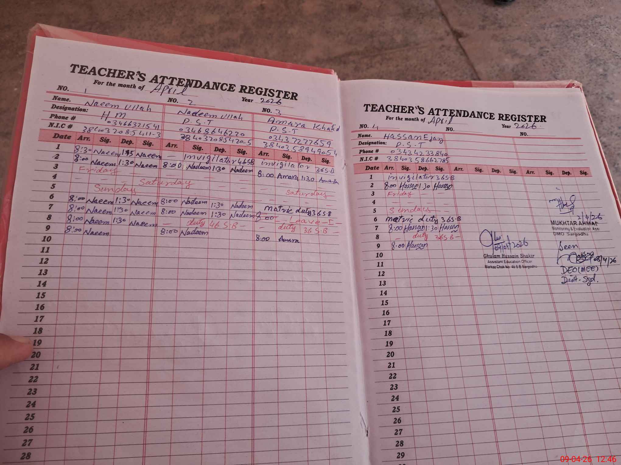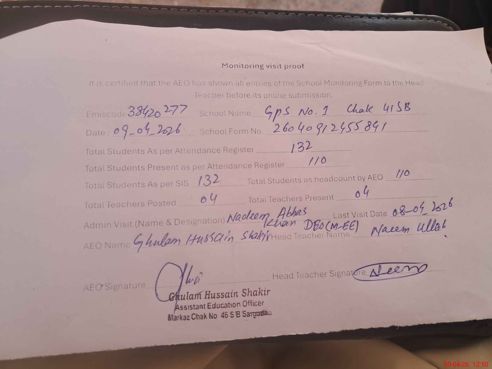 | Attendance Register | Head Teacher | MEA with School | Visit Proof |