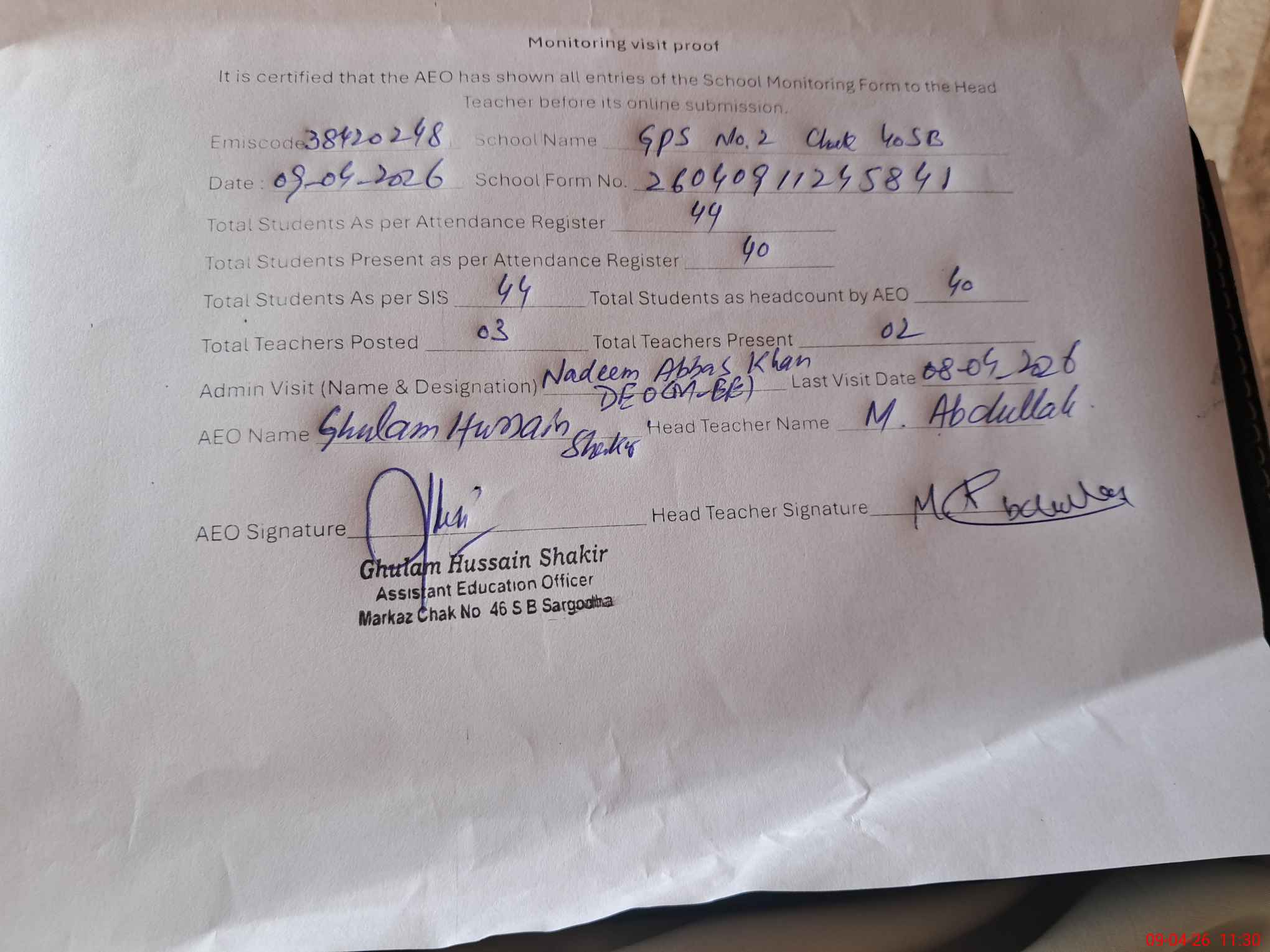 | EMIS Code: 38420248 | Name of School: GPS NO.2 CHAK NO.40 SB | |||