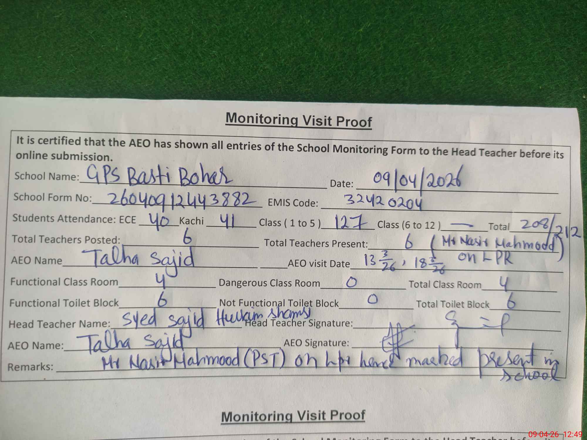 | Attendance Register | Head Teacher | MEA with School | Visit Proof |