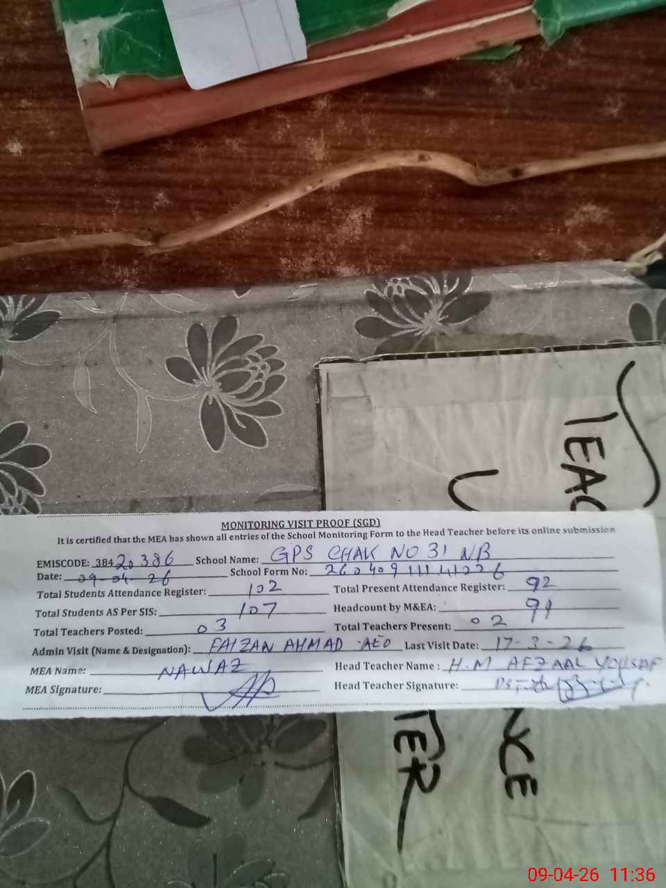 | EMIS Code: 38420386 | Name of School: GPS CHAK NO.31 NB | |||
