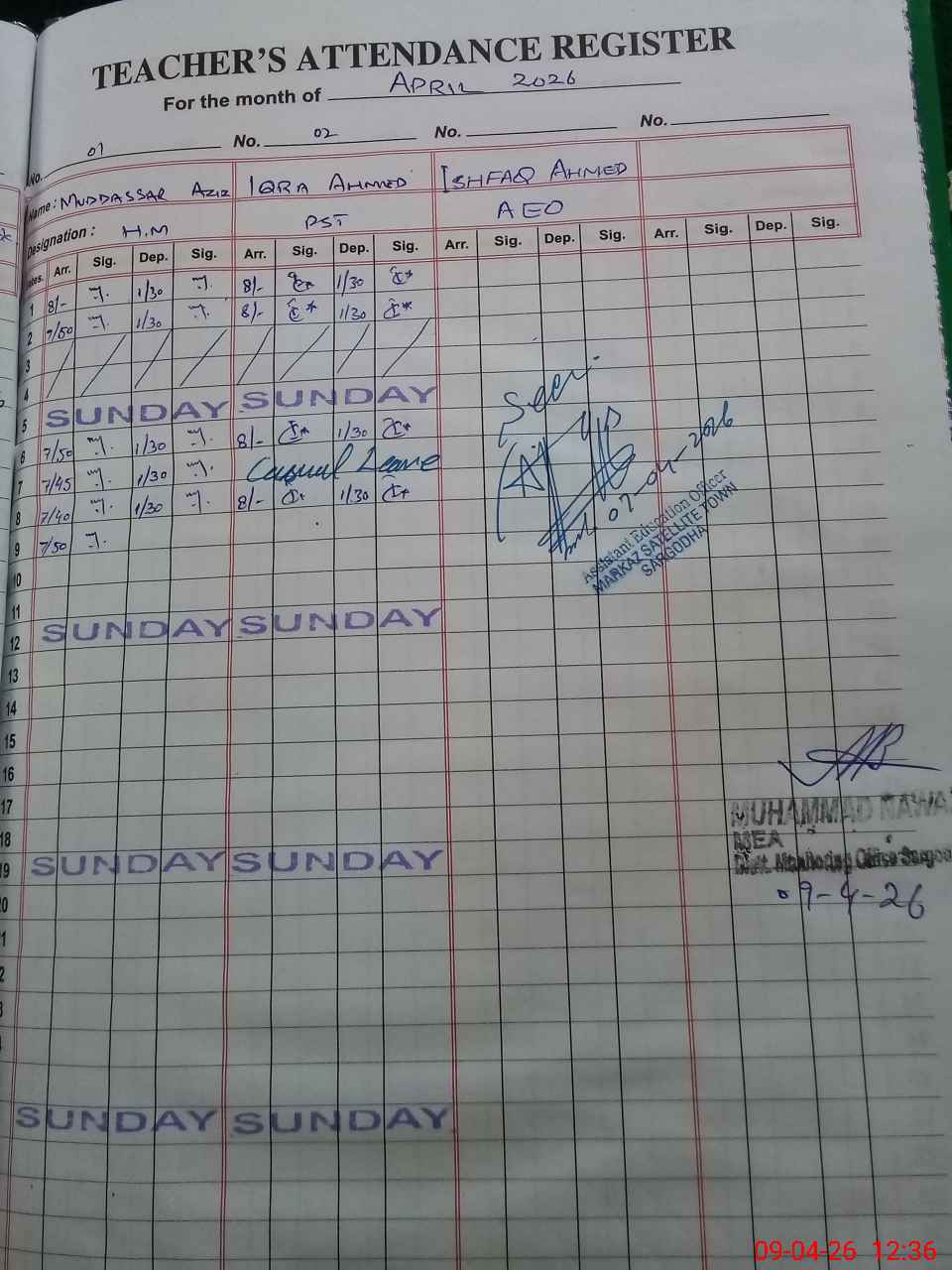 | Name: MU**** AZ**** Designation: (School Headmaster's/Headmistress's) PST Phone/Cell Number: 03**** |