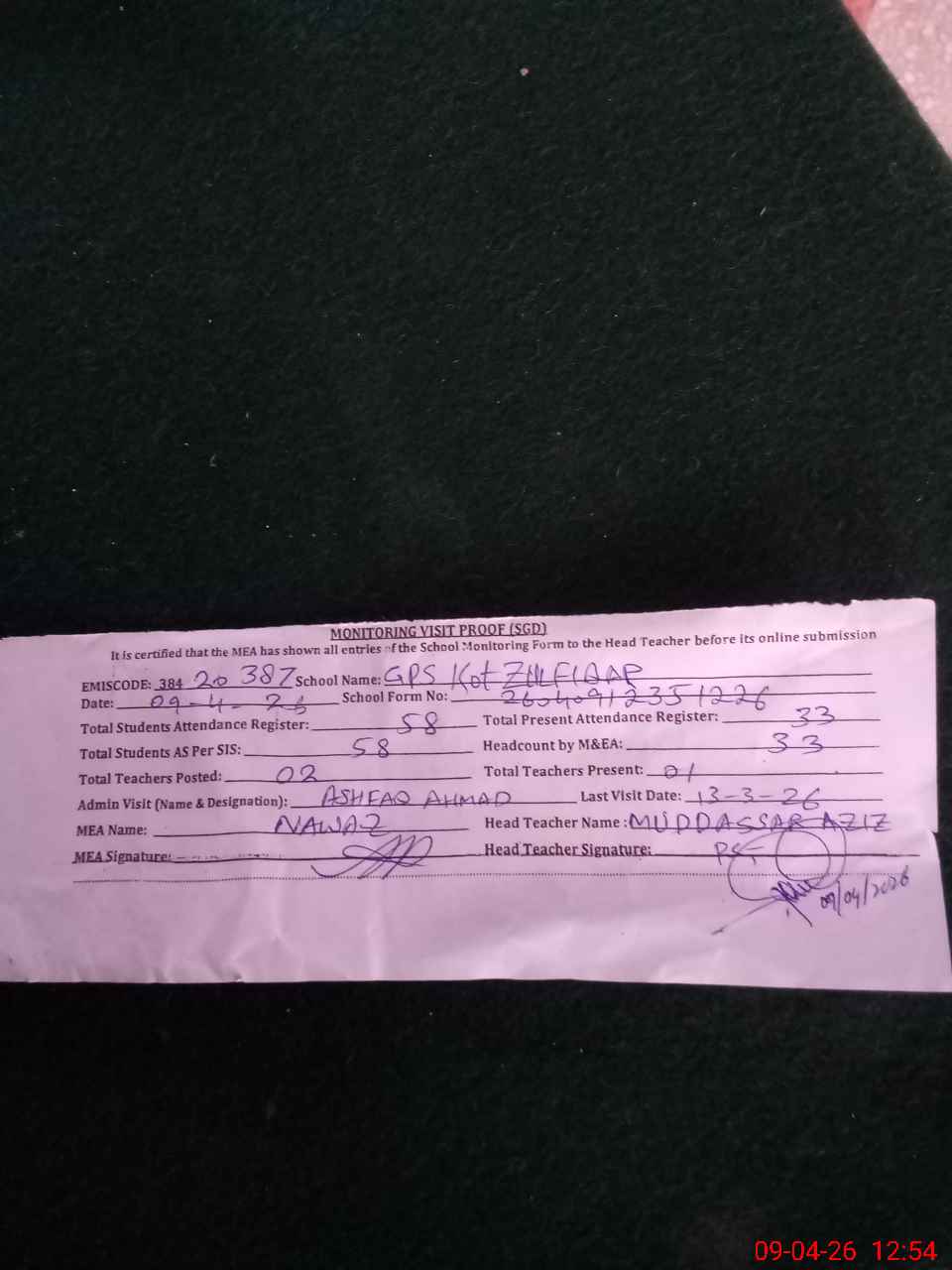 | Attendance Register | Head Teacher | MEA with School | Visit Proof |