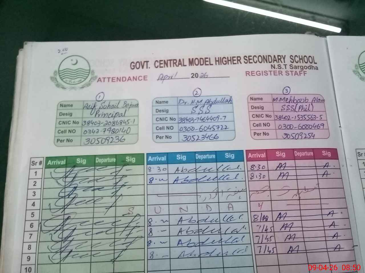 | CNIC | Full Name | Designation | R/C | Absence during last cal. month |