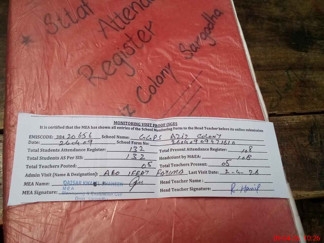 | Attendance Register | Head Teacher | MEA with School | Visit Proof |