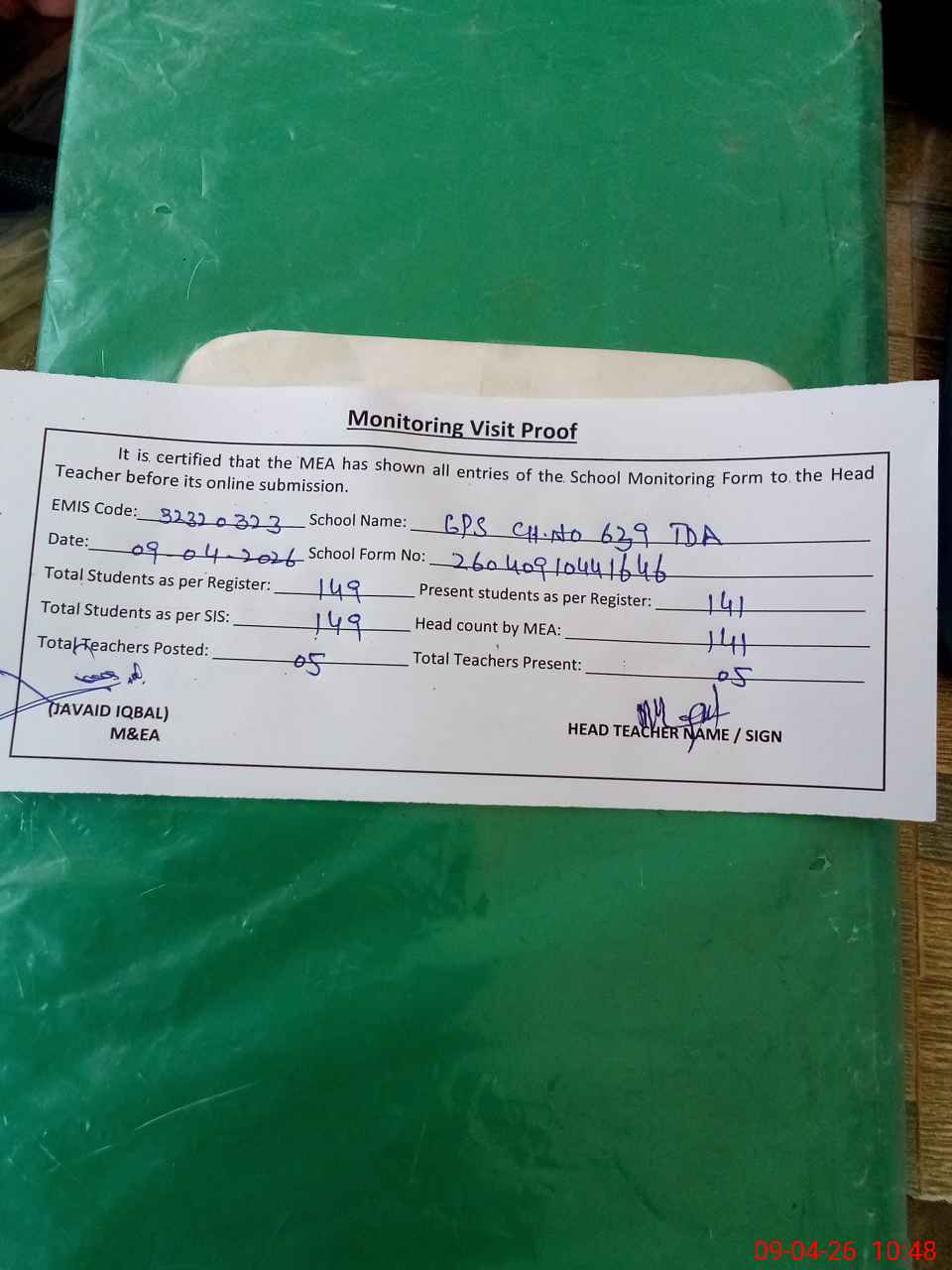| Attendance Register | Head Teacher | MEA with School | Visit Proof |