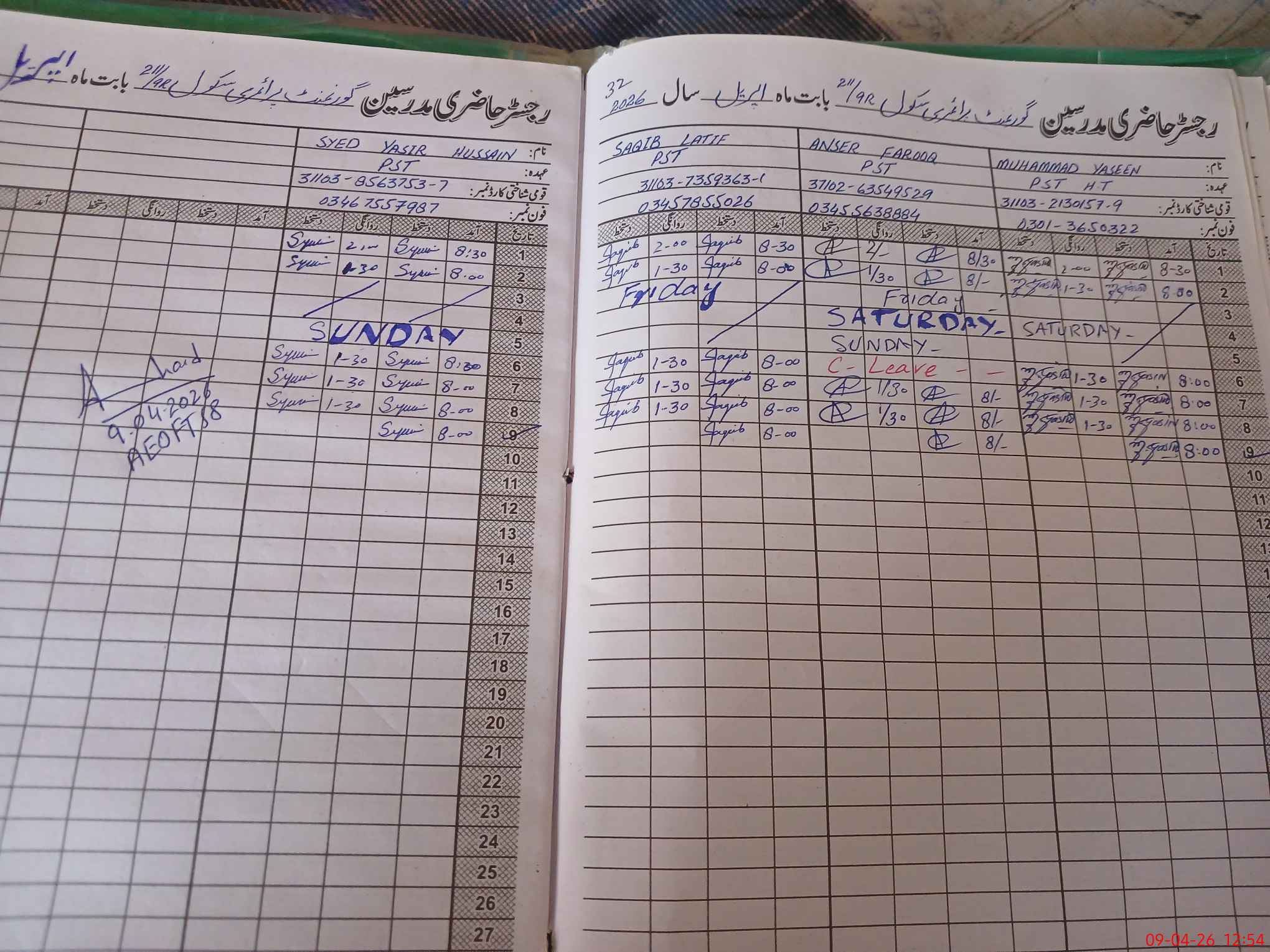 | CNIC | Full Name | Designation | R/C | Absence During Last Calender Month |