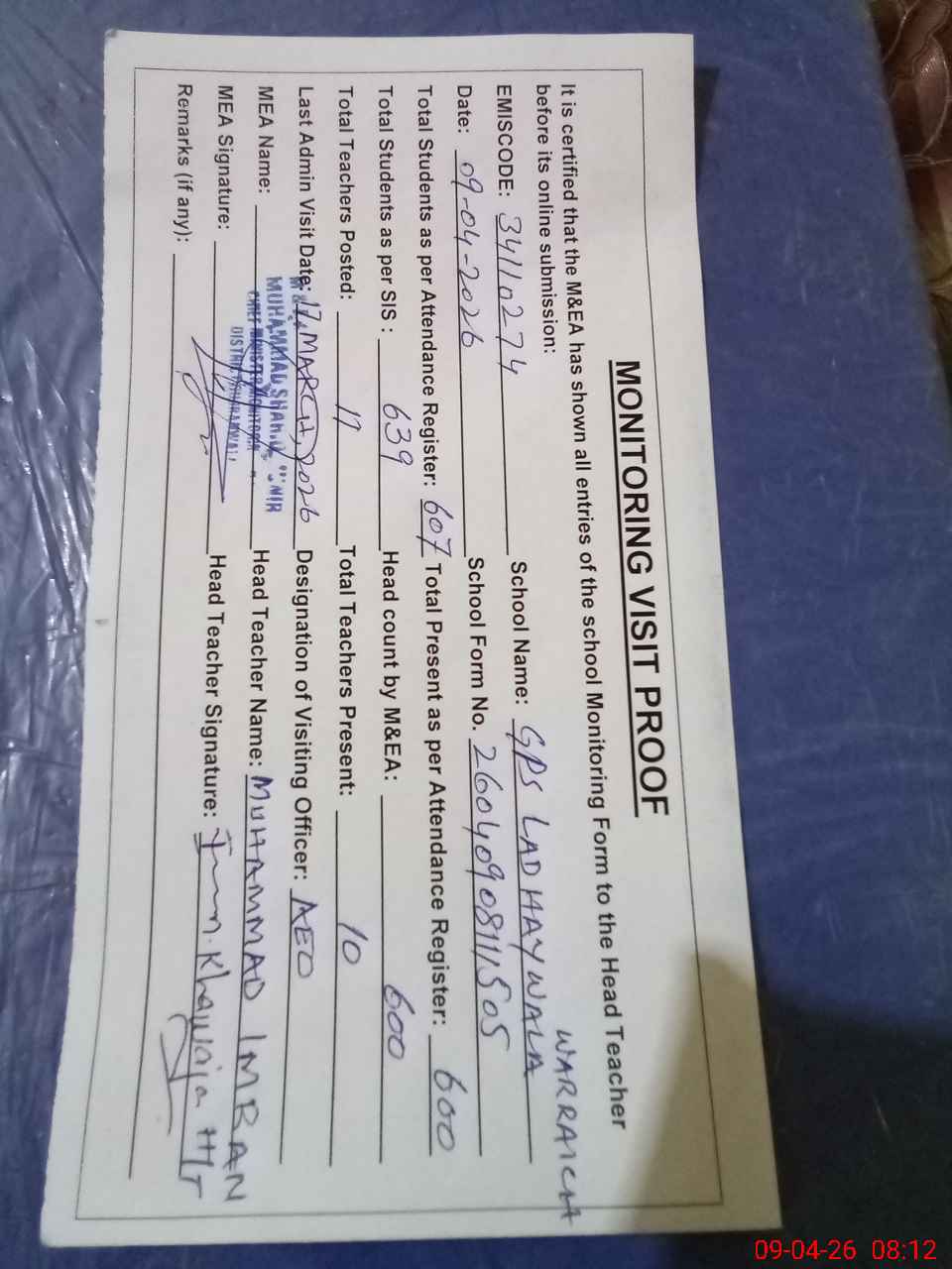 | EMIS Code: 34110274 | Name of School: GPS LADHAY WALA WARRAICH NO.2 | |||