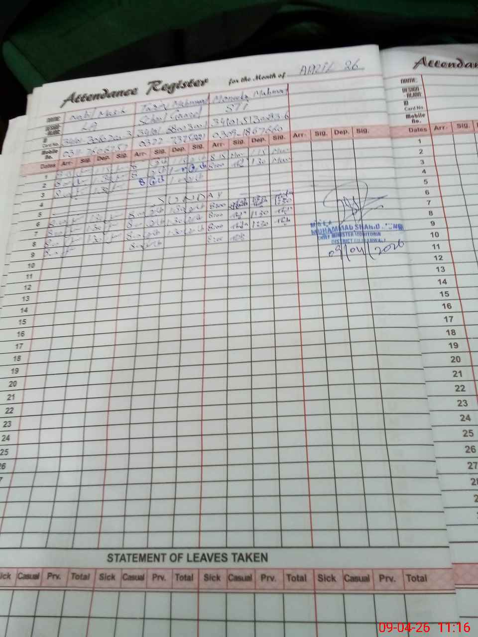 | CNIC | Full Name | Designation | R/C | Absence During Last Calender Month |