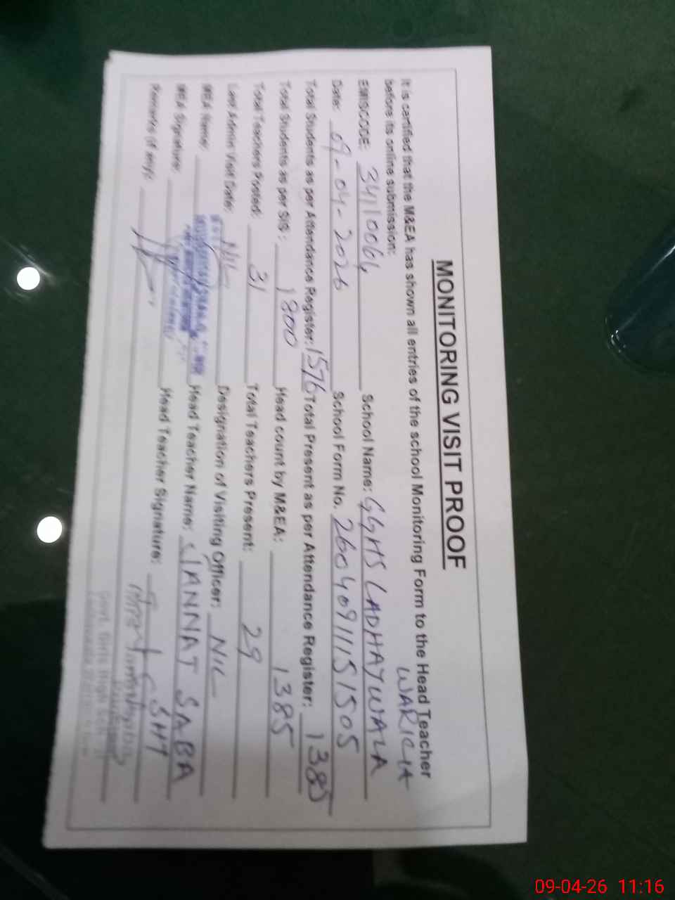 | Attendance Register | Head Teacher | MEA with School | Visit Proof |