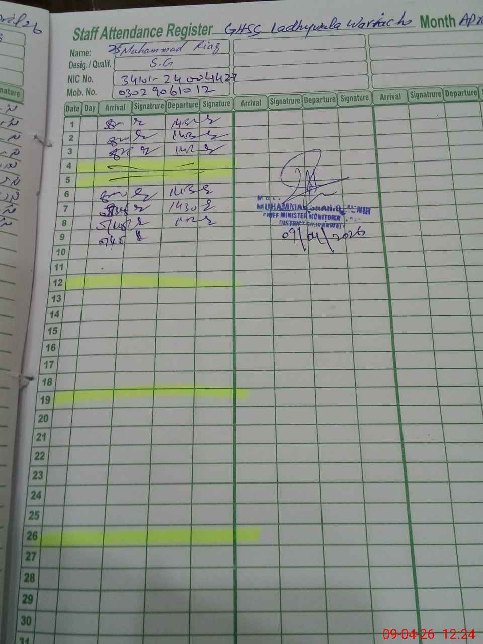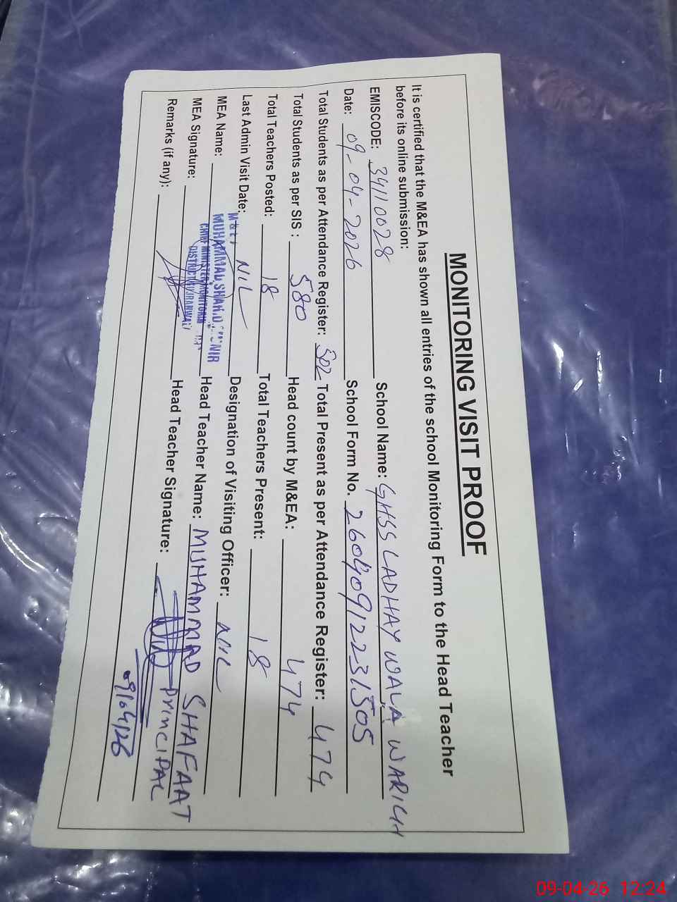 | EMIS Code: 34110028 | Name of School: GHSS LADHAY WALA WARRIACH | |||