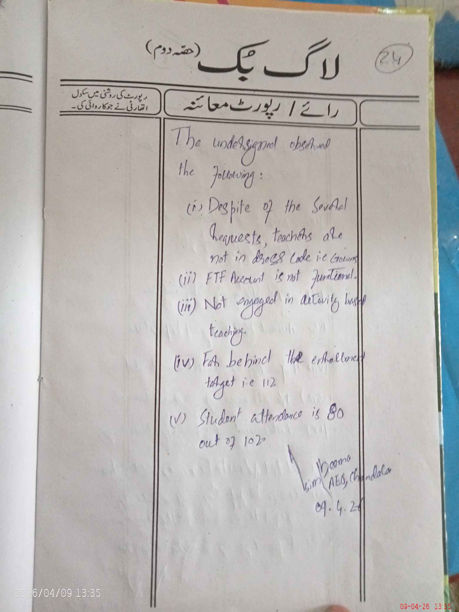 | Certified that this School was Inspected by the Undersigned MEA/DMO Today and the Information Stated Above is as Per Record. | |||||
