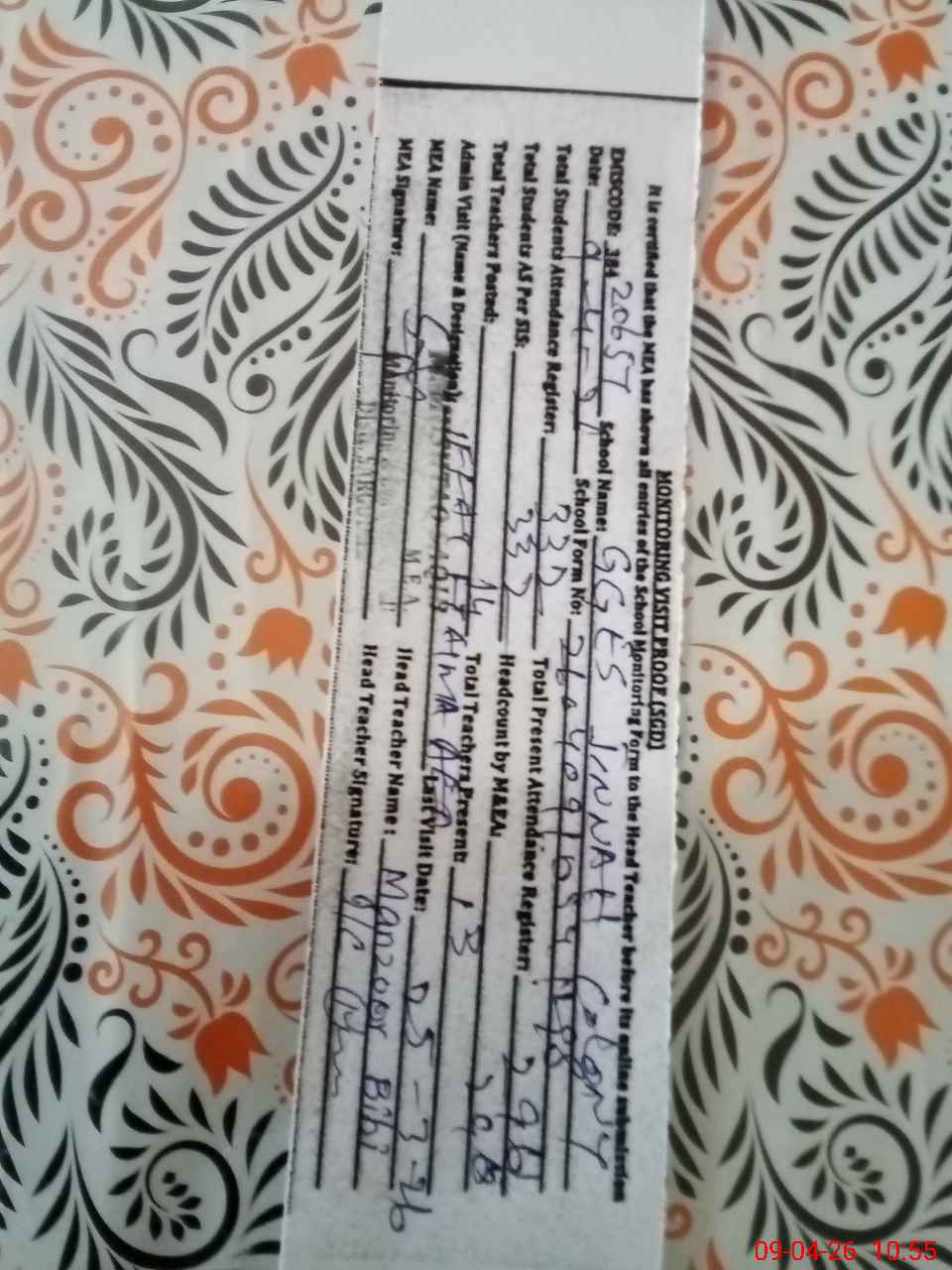 | Attendance Register | Head Teacher | MEA with School | Visit Proof |