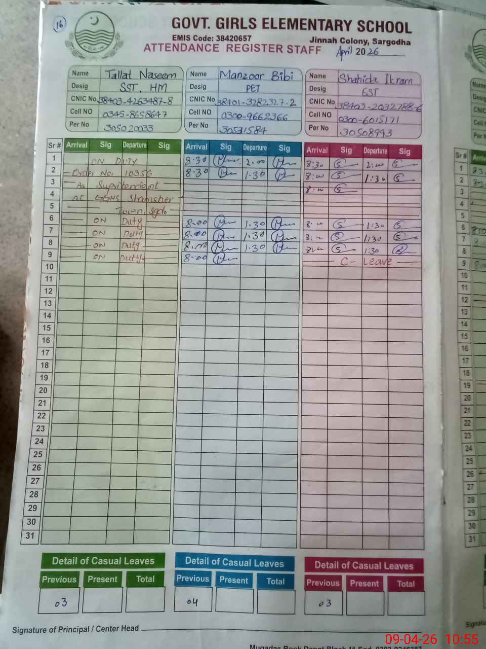 | CNIC | Full Name | Designation | R/C | Absence During Last Calender Month |