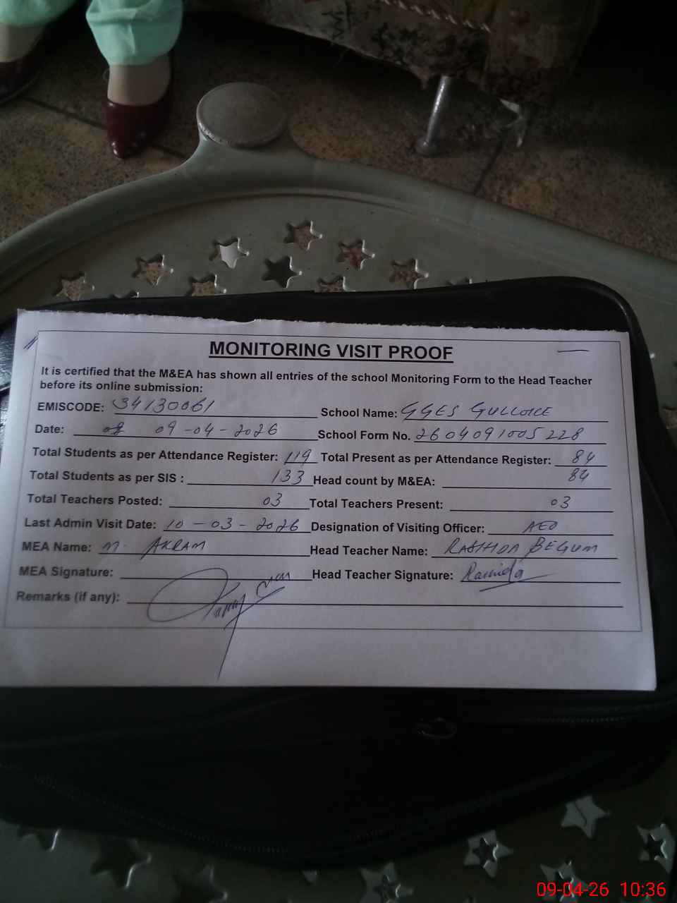 | Monitoring Date: 09-04-2026 | Start Time: 09-04-2026 09:58 AM | End Time: 09-04-2026 10:38 AM | Name of MEA: K-**** Ak**** | |
