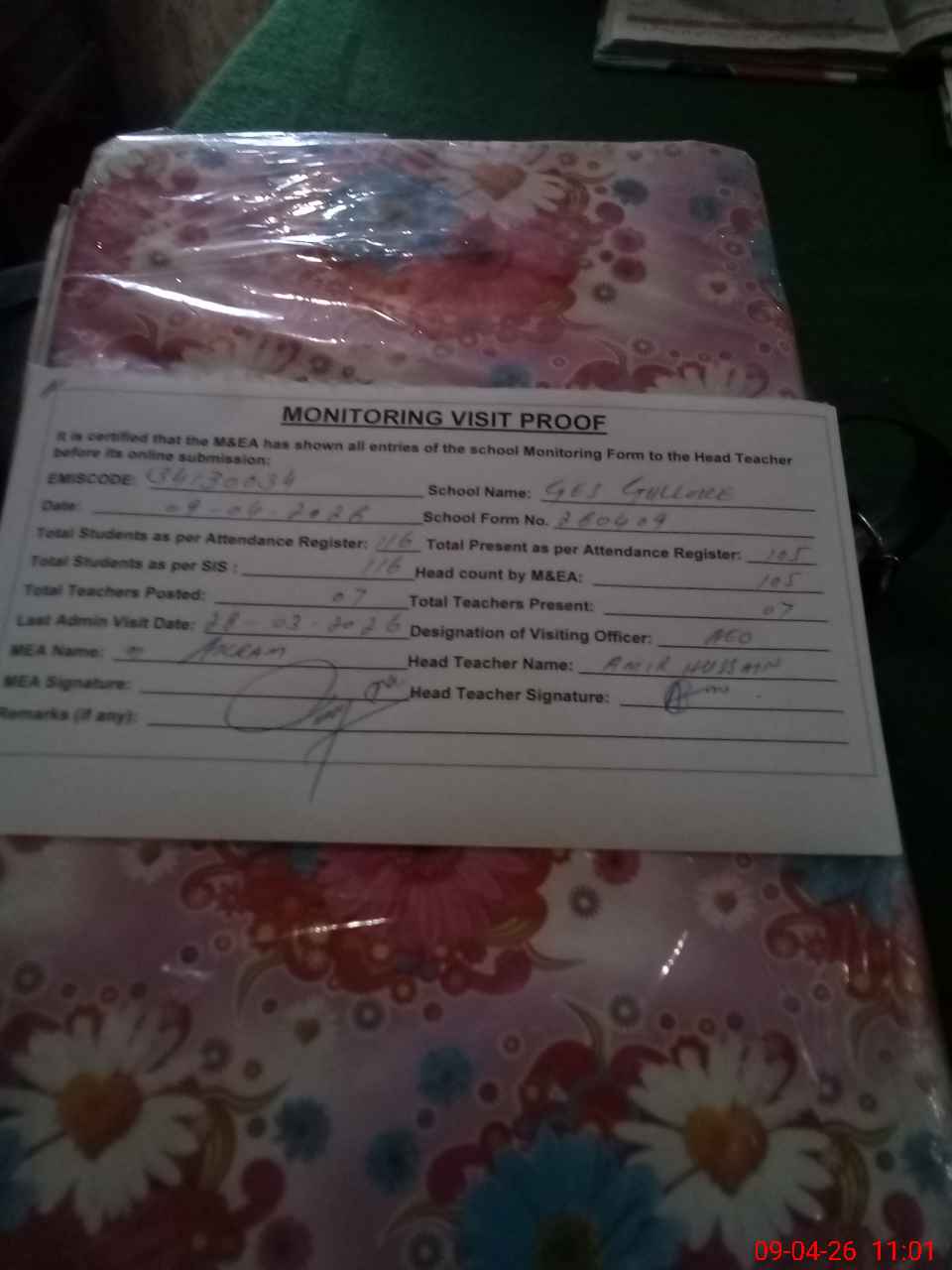 | Attendance Register | Head Teacher | MEA with School | Visit Proof |