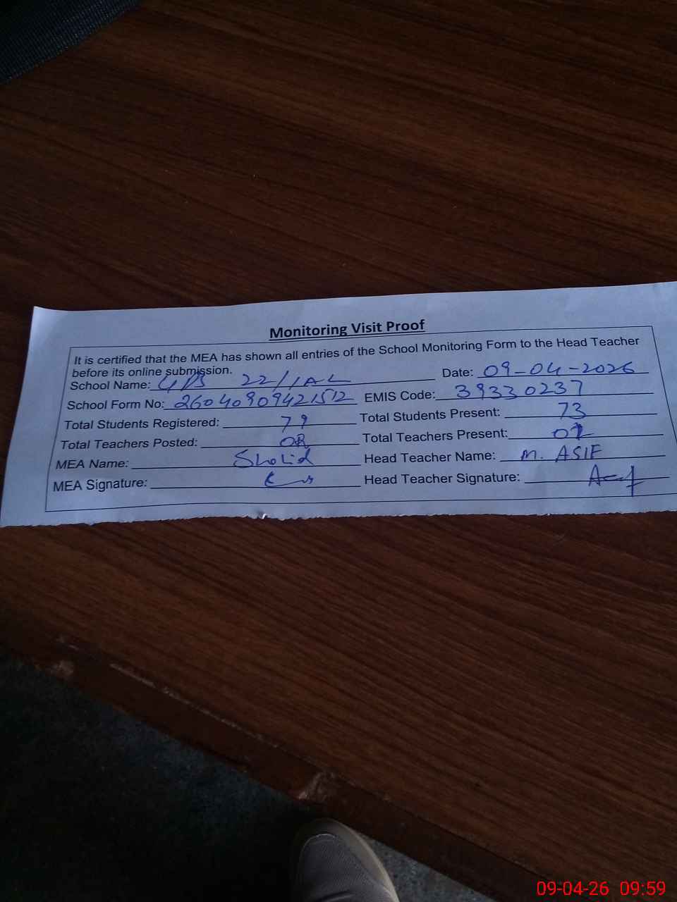 | EMIS Code: 39330237 | Name of School: GPS CHAK 22/1-AL | |||