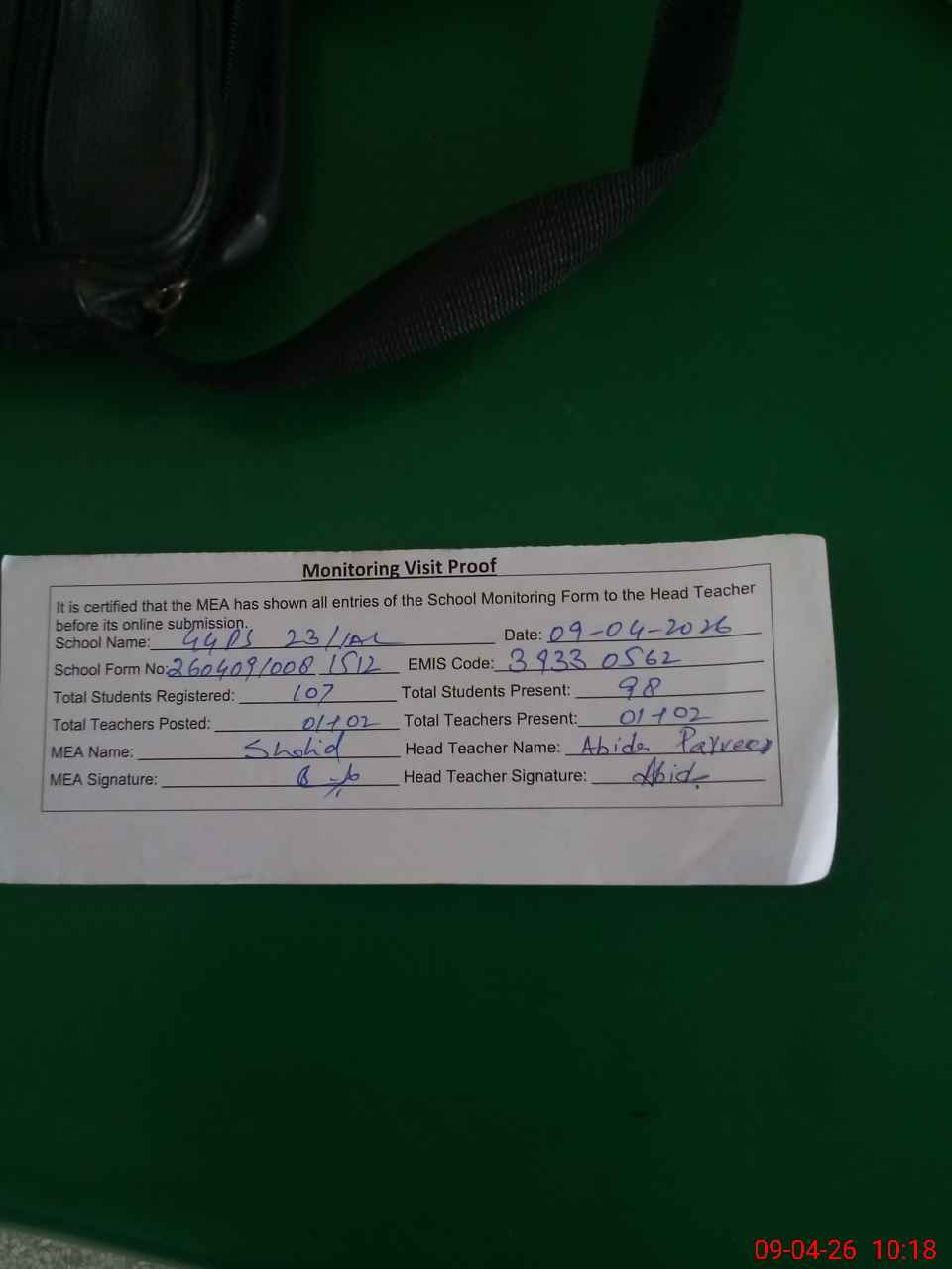 | Attendance Register | Head Teacher | MEA with School | Visit Proof |