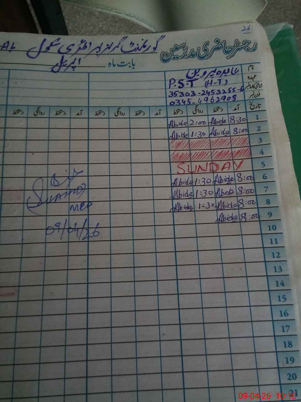 | Name: Ab**** Pa**** Designation: (School Headmaster's/Headmistress's) PST H.T Phone/Cell Number: 03**** |