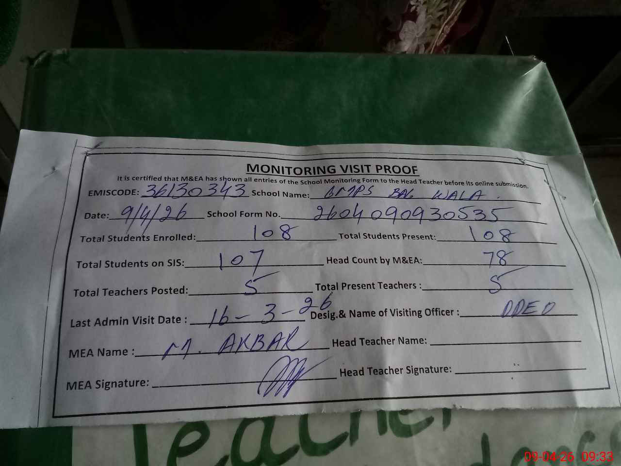 | EMIS Code: 36130343 | Name of School: GMPS BAGH WALA NEAR B Z UNIVERSITY | |||