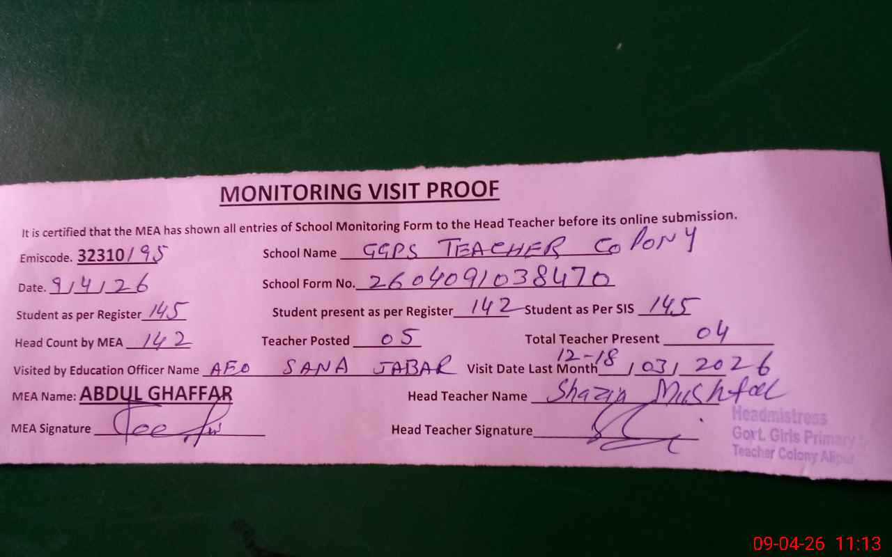 | EMIS Code: 32310195 | Name of School: GGPS TEACHER COLONY | |||