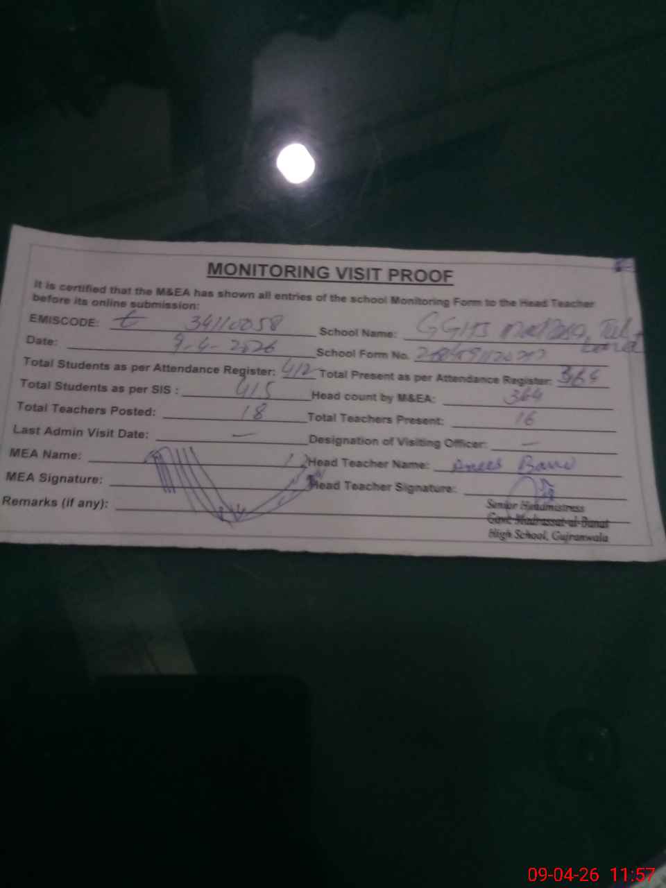 | EMIS Code: 34110058 | Name of School: GGHS MADRASA-TUL-BINAT | |||