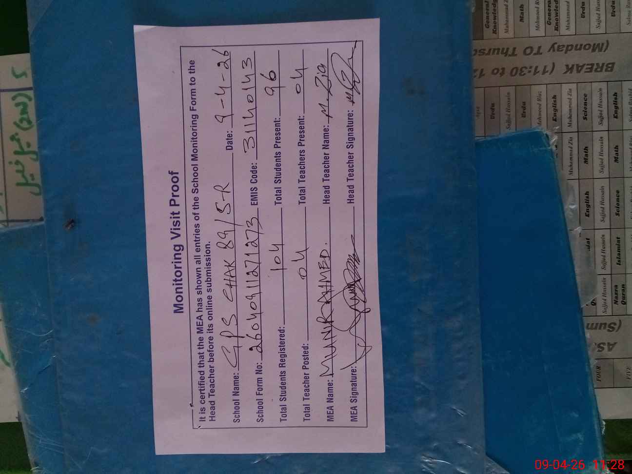 | Attendance Register | Head Teacher | MEA with School | Visit Proof |