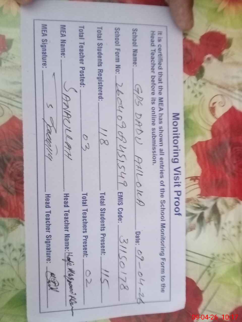 | Attendance Register | Head Teacher | MEA with School | Visit Proof |