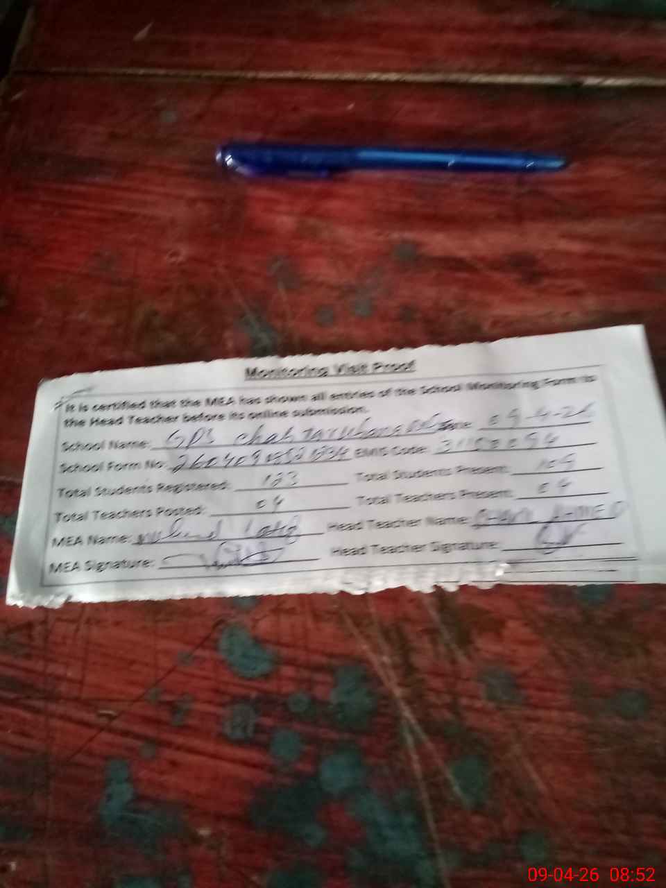| Attendance Register | Head Teacher | MEA with School | Visit Proof |