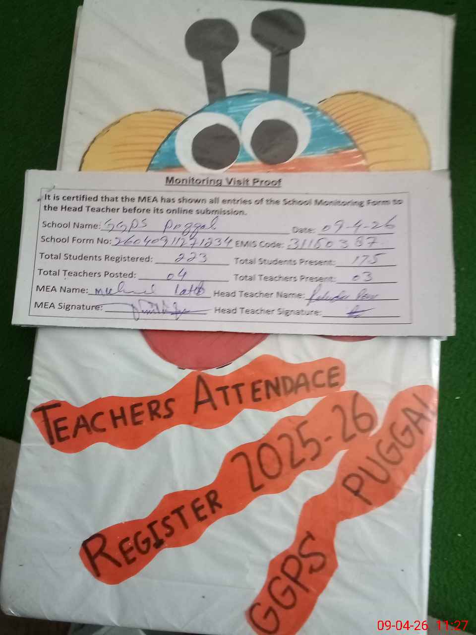 | Attendance Register | Head Teacher | MEA with School | Visit Proof |
