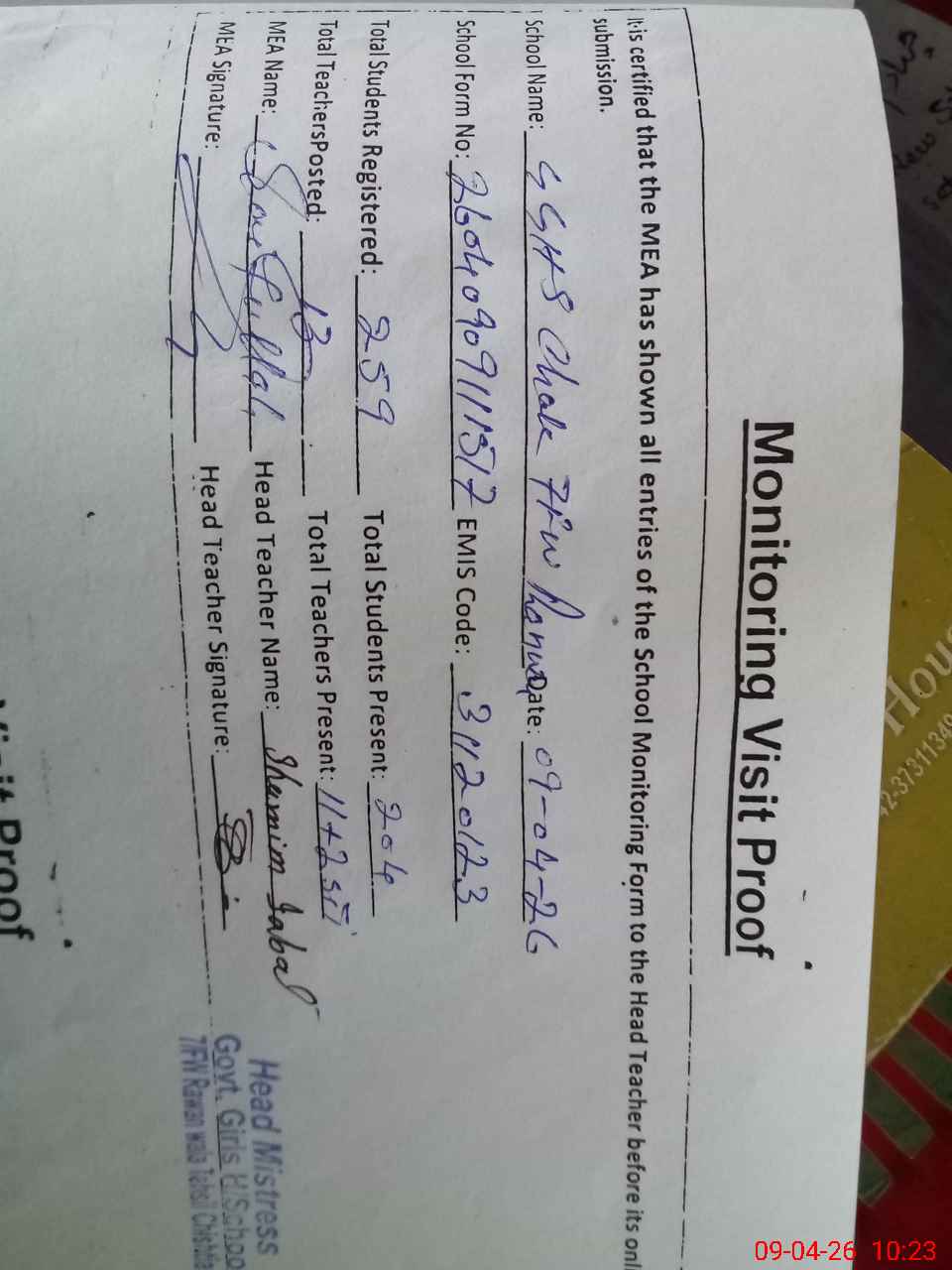| EMIS Code: 31120123 | Name of School: GGHS CHAK 7/FW RANWAN WALA | |||