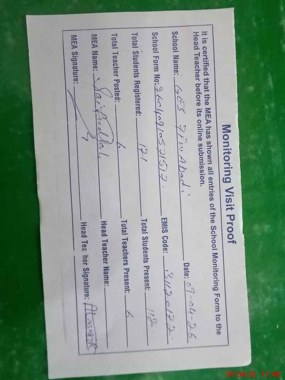 | Attendance Register | Head Teacher | MEA with School | Visit Proof |