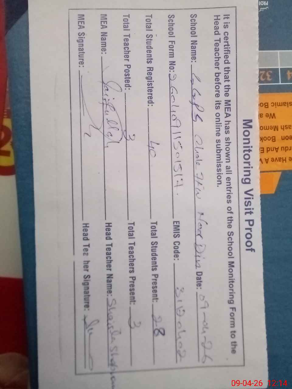 | Attendance Register | Head Teacher | MEA with School | Visit Proof |
