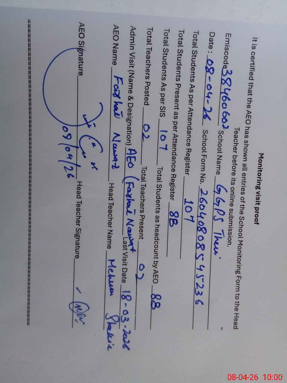 | Certified that this School was Inspected by the Undersigned MEA/DMO Today and the Information Stated Above is as Per Record. | |||||