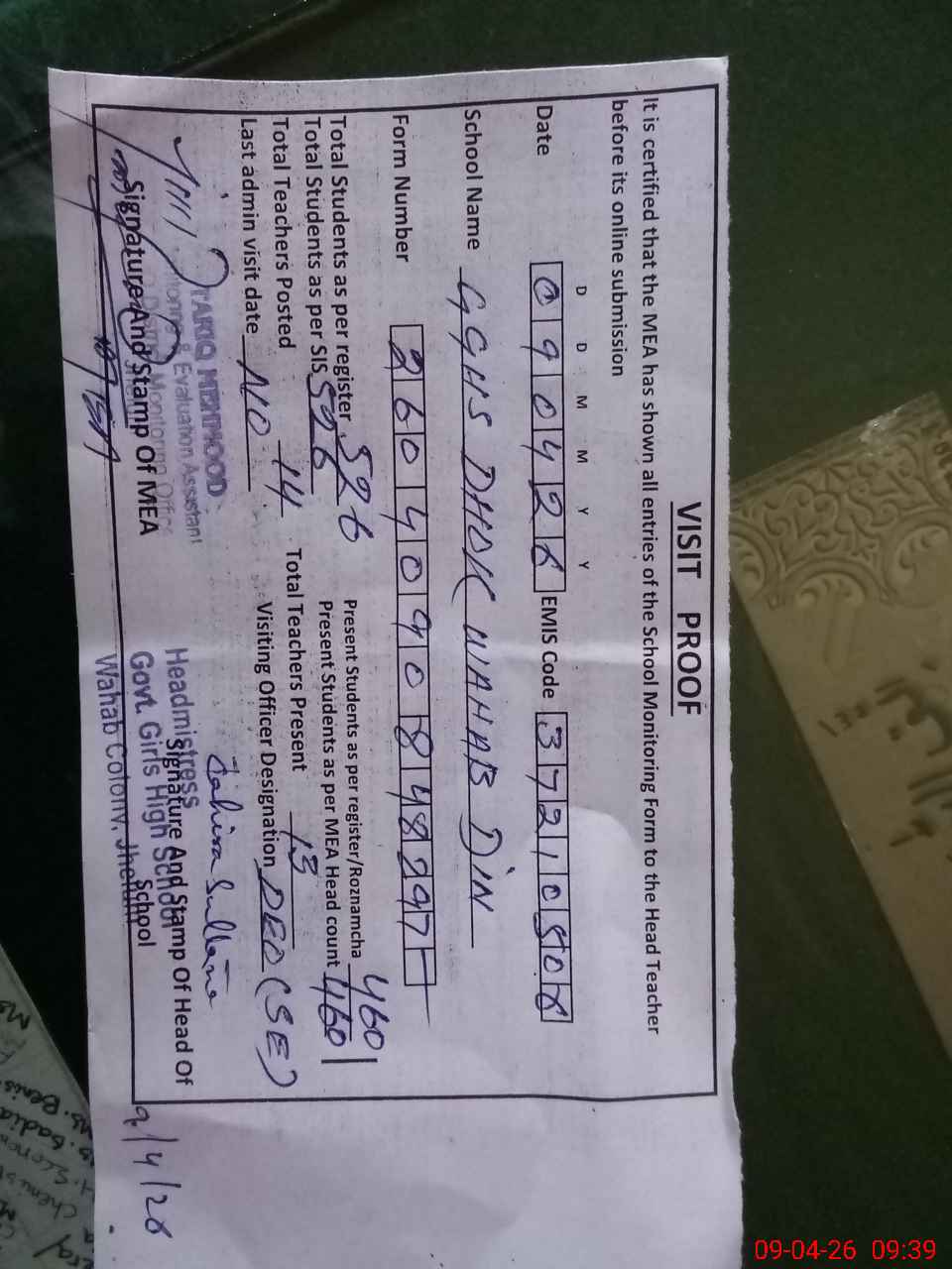 | EMIS Code: 37210506 | Name of School: GGHS DHOK WAHAB DIN | |||