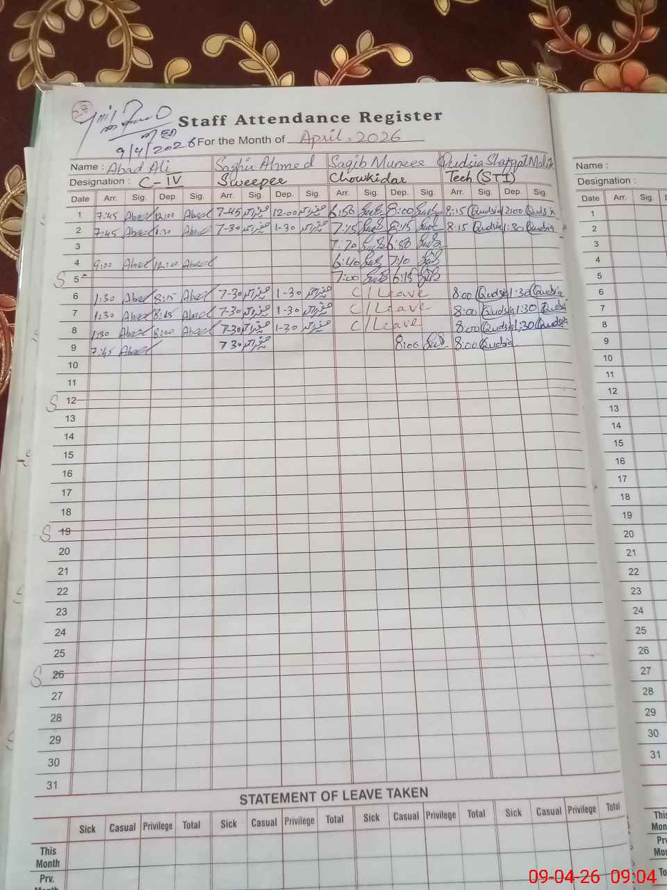 | Monitoring Date: 09-04-2026 | Start Time: 09-04-2026 08:48 AM | End Time: 09-04-2026 09:41 AM | Name of MEA: Ta**** Me**** | |