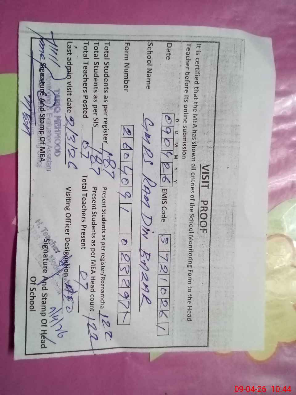 | Attendance Register | Head Teacher | MEA with School | Visit Proof |