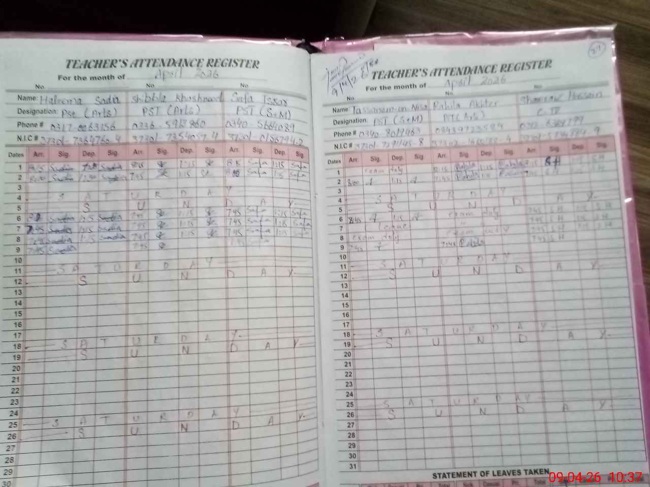 | CNIC | Full Name | Designation | R/C | Absence During Last Calender Month |